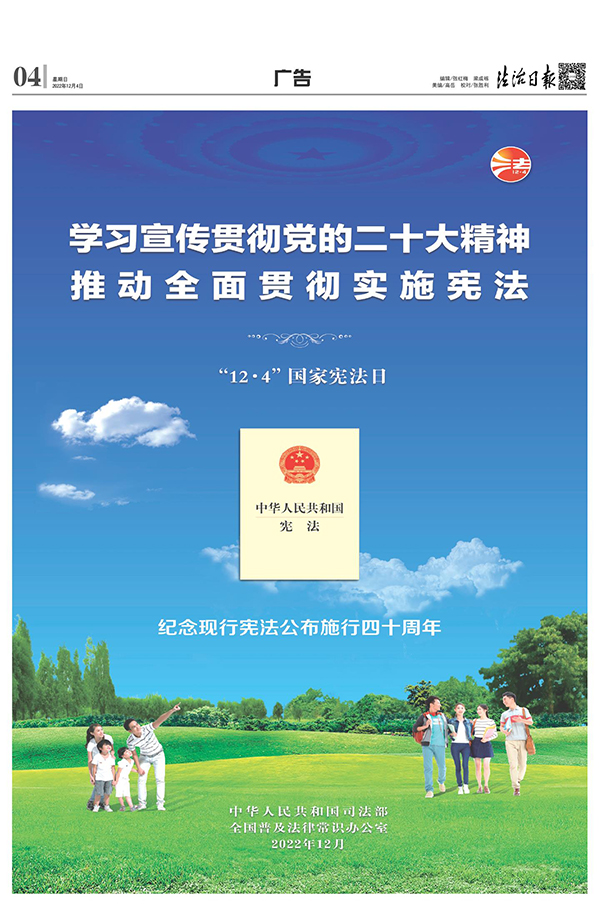 刊发公益广告。2022年《法治日报》共刊发11期公益广告。在“3·15”消费者权益保护日、全民国家安全教育日、“6·26”国际禁毒日等重要时间节点设计公益广告并在新媒体平台推出。