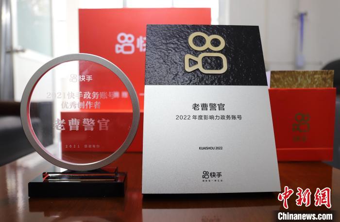 走进灵台县看守所办公区二楼曹晓鸣的办公室,办公桌前摆放着的两块纪念奖杯让人眼前一亮,一块是“2021年荣获快手平台优秀创作者奖”奖杯,一块是“2022年荣获快手平台年度影响力政务账号”奖杯。