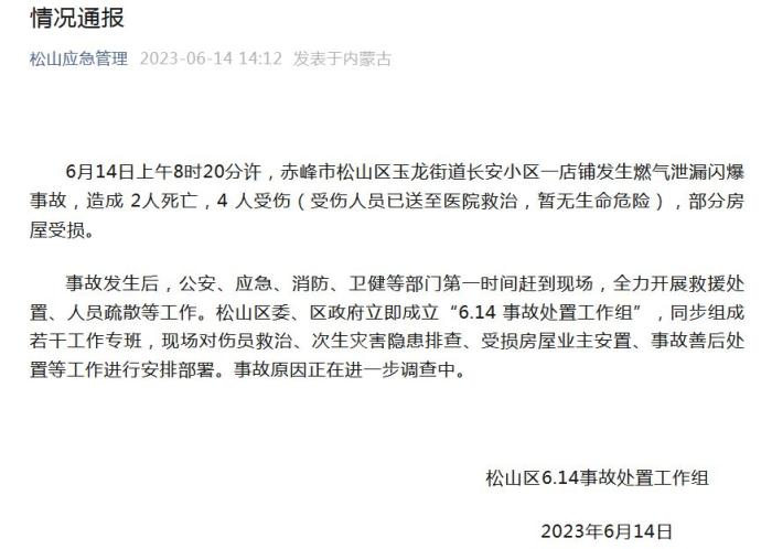 中新网6月14日电据“松山应急管理”微信公众号消息,6月14日上午8时20分许,赤峰市松山区玉龙街道长安小区一店铺发生燃气泄漏闪爆事故,造成2人死亡,4人受伤(受伤人员已送至医院救治,暂无生命危险),部分房屋受损。