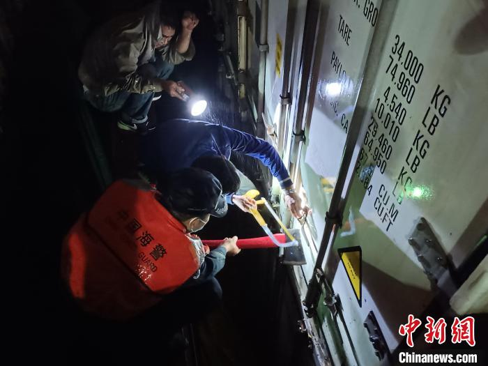 执法人员开启装载冻品集装箱。 殷泽华 摄