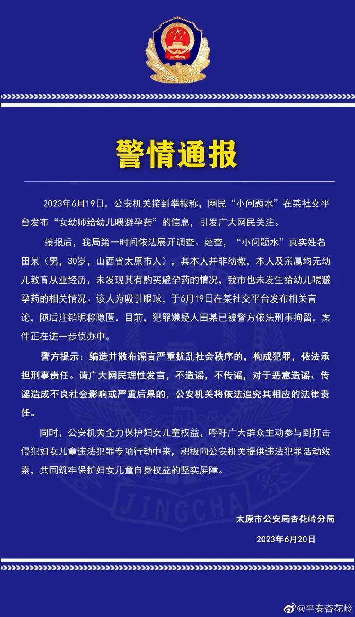 20日,太原市公安局杏花岭区分局官方微博@平安杏花岭发布通报:网民“小问题水”真实姓名田某(男,30岁,山西省太原市人),其本人并非幼教,本人及亲属均无幼儿教育从业经历,未发现其有购买避孕药的情况,我市也未发生给幼儿喂避孕药的相关情况。该人为吸引眼球,于6月19日在某社交平台发布相关言论,随后注销昵称隐匿。目前,犯罪嫌疑人田某已被警方依法刑事拘留。