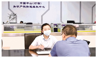 图为在中国中山(灯饰)知识产权快速维权中心,工作人员正为群众解答外观专利快速通道受理条件和流程等问题。