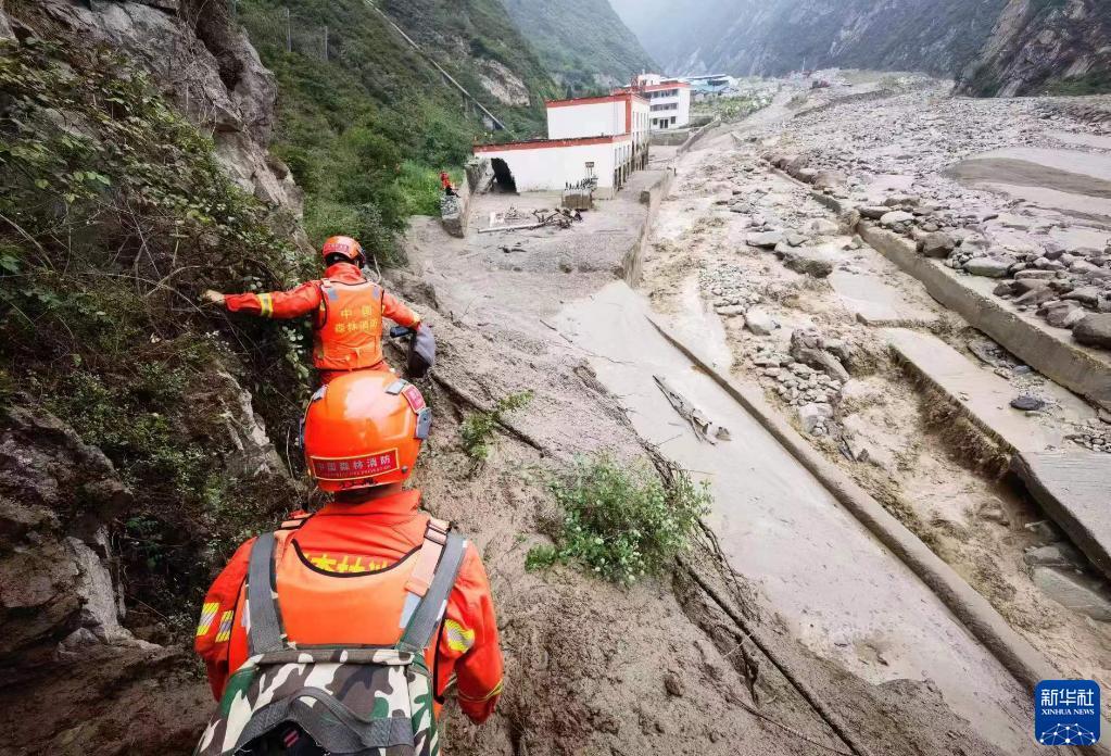 6月27日,救援人员在四川省汶川县绵虒镇板子沟泥石流灾害现场勘查。新华社发