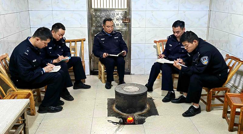 胡学军(中)组织民警研究派出所执法工作。柳敬军 摄