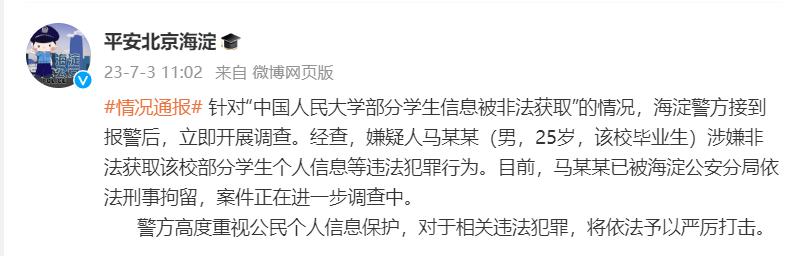 中新网7月3日电 据平安北京海淀官方微博3日消息,针对“中国人民大学部分学生信息被非法获取”的情况,海淀警方接到报警后,立即开展调查。经查,嫌疑人马某某(男,25岁,该校毕业生)涉嫌非法获取该校部分学生个人信息等违法犯罪行为。目前,马某某已被海淀公安分局依法刑事拘留,案件正在进一步调查中。