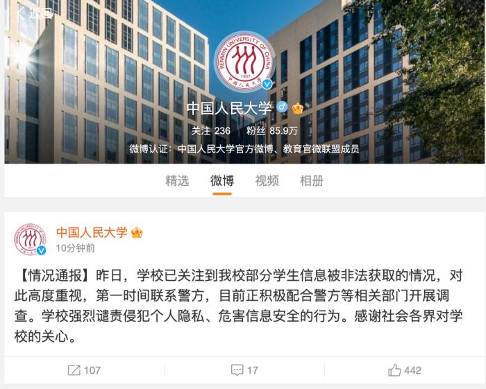7月2日,@中国人民大学官方微博发布情况通报:昨日,学校已关注到我校部分学生信息被非法获取的情况,对此高度重视,第一时间联系警方,目前正积极配合警方等相关部门开展调查。学校强烈谴责侵犯个人隐私、危害信息安全的行为。感谢社会各界对学校的关心。