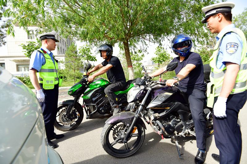 连日来,甘肃省临泽县公安局交警大队开展打击整治“飙车炸街”违法犯罪专项行动,切实维护道路交通秩序和公共安全。图为6月6日,交警正在严查道路“飙车炸街”违法行为。本报通讯员 安学海 摄