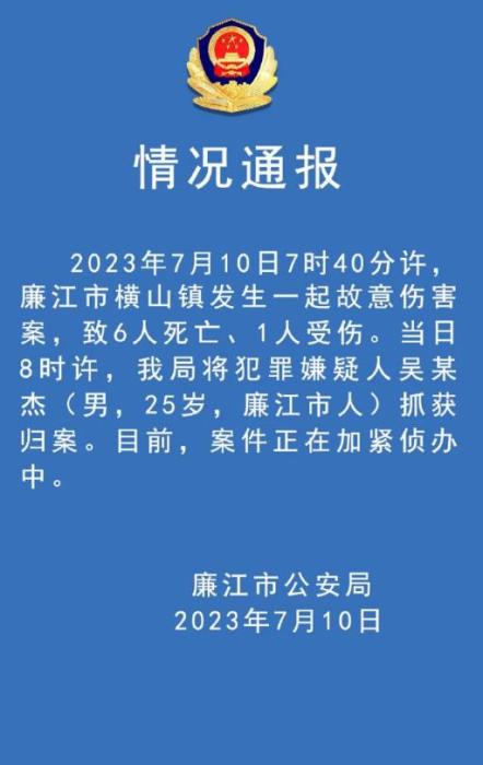 中新网7月10日电 据平安廉江微信公众号消息,廉江市公安局7月10日发布情况通报称,2023年7月10日7时40分许,廉江市横山镇发生一起故意伤害案,致6人死亡、1人受伤。当日8时许,廉江市公安局将犯罪嫌疑人吴某杰(男,25岁廉江市人)抓获归案。目前,案件正在加紧侦办中。