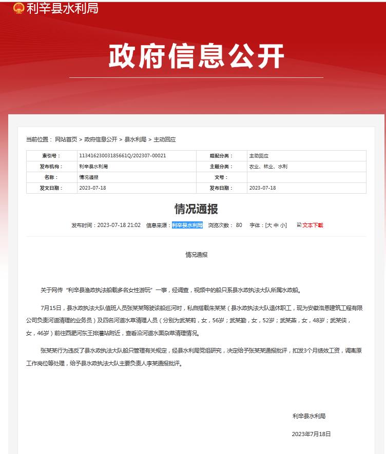 中新网7月19日电据利辛县人民政府网站消息,利辛县水利局18日发布情况通报称,关于网传“利辛县渔政执法船载多名女性游玩”一事,经调查,视频中的船只系县水政执法大队所属水政船。