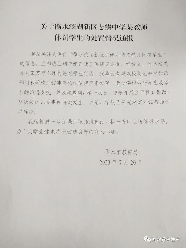 中新网7月20日电 据“衡水教育发布”微信公众号消息,衡水市教育局20日发布情况通报称,经核查,衡水滨湖新区志臻中学教师刘某某存在体罚违纪学生行为。目前,学校已研究决定对该教师予以辞退。