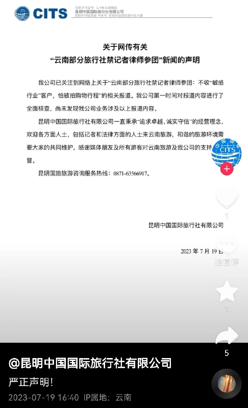 19日,昆明中国国际旅行社有限公司发布相关声明,称公司已关注到网络上关于“云南部分旅行社禁记者律师参团:不收‘敏感行业’客户,怕被拍购物行程”的相关报道,第一时间对报道内容进行了全面核查,尚未发现公司业务涉及以上报道内容。