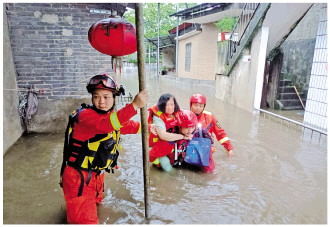 近日,受暴雨影响,江西省萍乡市部分道路及小区积水严重,水位深处达1.5米,导致多名老人被困家中。萍乡消防接到报告后,立即调派救援力量赶赴现场救援。图为消防员正在转移受困老人。 本报记者 黄辉 本报通讯员 李科 摄