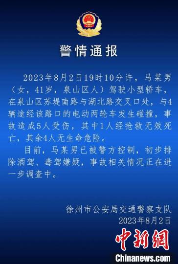 警情通报称,2023年8月2日19时10分许,马某男(女,41岁,泉山区人)驾驶小型轿车,在泉山区苏堤南路与湖北路交叉口处,与4辆途经该路口的电动两轮车发生碰撞,事故造成5人受伤,其中1人经抢救无效死亡,其余4人无生命危险。