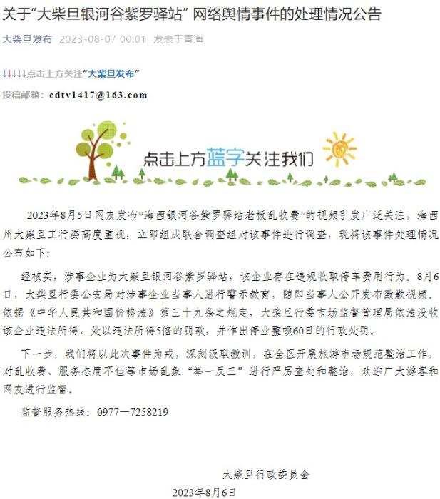 中新网8月7日电 据“大柴旦发布”微信公众号消息,大柴旦行政委员会6日发布关于“大柴旦银河谷紫罗驿站”网络舆情事件的处理情况公告。公告称,2023年8月5日网友发布“海西银河谷紫罗驿站老板乱收费”的视频引发广泛关注,海西州大柴旦工行委高度重视,立即组成联合调查组对该事件进行调查,经核实,涉事企业为大柴旦银河谷紫罗驿站,该企业存在违规收取停车费用行为。