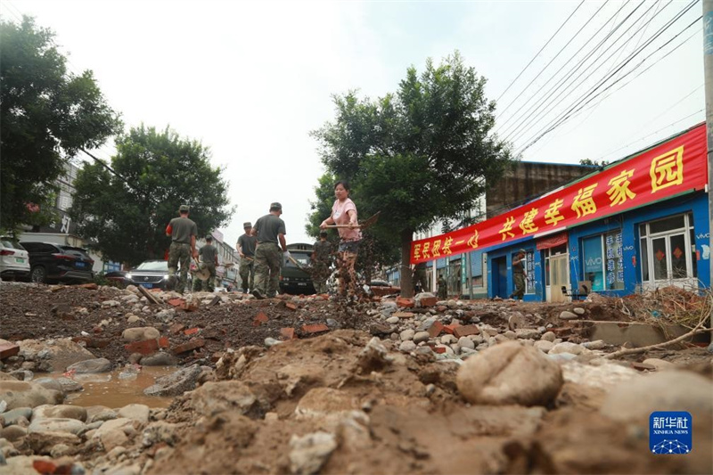 8月7日,武警河北总队机动支队官兵在涿州朝阳大街搬运垃圾、清淤清泥、冲洗街道。新华社发 (赵佳亮 摄)