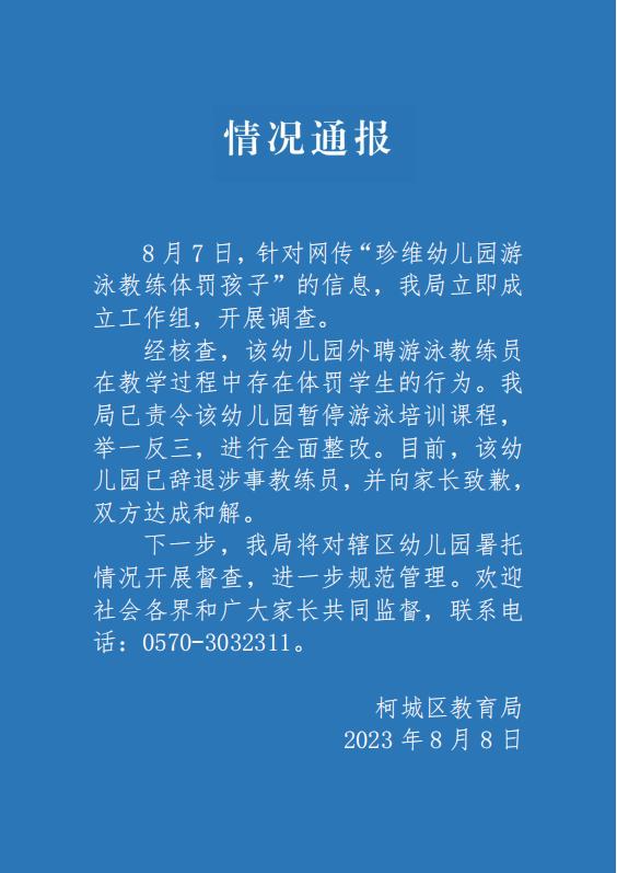 中新网8月8日电 据浙江衢州柯城区教育局微信公众号消息,8月7日,针对网传“珍维幼儿园游泳教练体罚孩子”的信息,柯城区教育局立即成立工作组,开展调查。