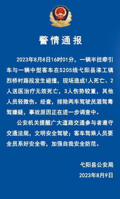 中新网8月9日电 弋阳公安在线微信公众号9日发布警情通报。2023年8月8日16时01分,一辆半挂牵引车与一辆中型客车在S205线弋阳县漆工镇烈桥村路段发生碰撞,现场造成1人死亡、2人送医治疗无效死亡,3人伤势较重,其他人员轻微伤。经查,排除两车驾驶员酒驾毒驾嫌疑,事故原因正在进一步调查中。