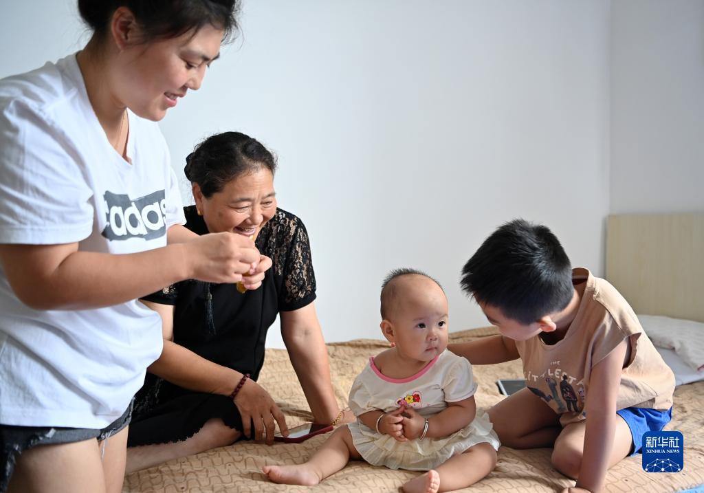 8月9日,转移群众在亲和儒园安置点内照看小孩。据了解,东淀蓄滞洪区启用后,天津市静海区共集中安置了2000余名群众。连日来,静海区全力保障转移群众在集中安置点的生活。新华社记者 李然 摄