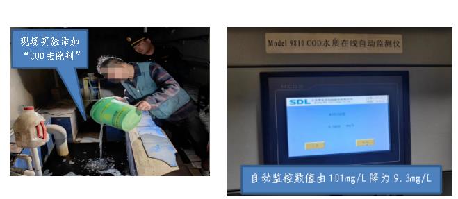 2023年3月29日下午,执法人员对该单位进行现场突击检查。现场检查发现,该单位总排口COD自动监控数据上升至100mg/L左右,与平时的数据反差极大。执法人员通过全面排查该单位的自动监控设施,未发现设施有异常情况,在排除采样环节稀释样品、分析环节修改参数等常见的造假可能后,执法人员现场对该单位使用的药剂进行逐一排查,发现部分药剂未标明成分,十分可疑。经进一步调查,该单位操作人员最终承认,平时为防止COD自动监控数据超标,在总排口处添加了“COD去除剂”,执法人员现场检查时未敢添加,导致自动监控数据反弹至真实水平。该操作人员随后现场演示了添加药剂的过程,在此期间COD自动监控数值由101mg/L降为9.3mg/L。经专业机构鉴定,该药剂为浓度超过99%的氯酸钠,生态环境部门将此案件信息通报公安机关后,公安机关立即对“COD去除剂”销售链上下游开展追查,已锁定上游卖家2家。