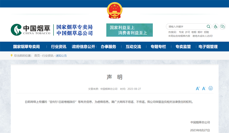 据中国烟草总公司网站消息,日前网络上传播的“自9月1日起卷烟涨价”等有关信息,为虚假信息。请广大网民不信谣、不传谣。中国烟草总公司保留追究相关法律责任的权利。