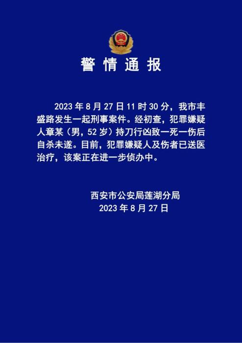 中新网8月28日电 27日,西安市公安局莲湖分局在官方微信公众号发布警情通报称,8月27日11时30分,西安市丰盛路发生一起刑事案件。经初查,犯罪嫌疑人章某(男,52岁)持刀行凶致一死一伤后自杀未遂。