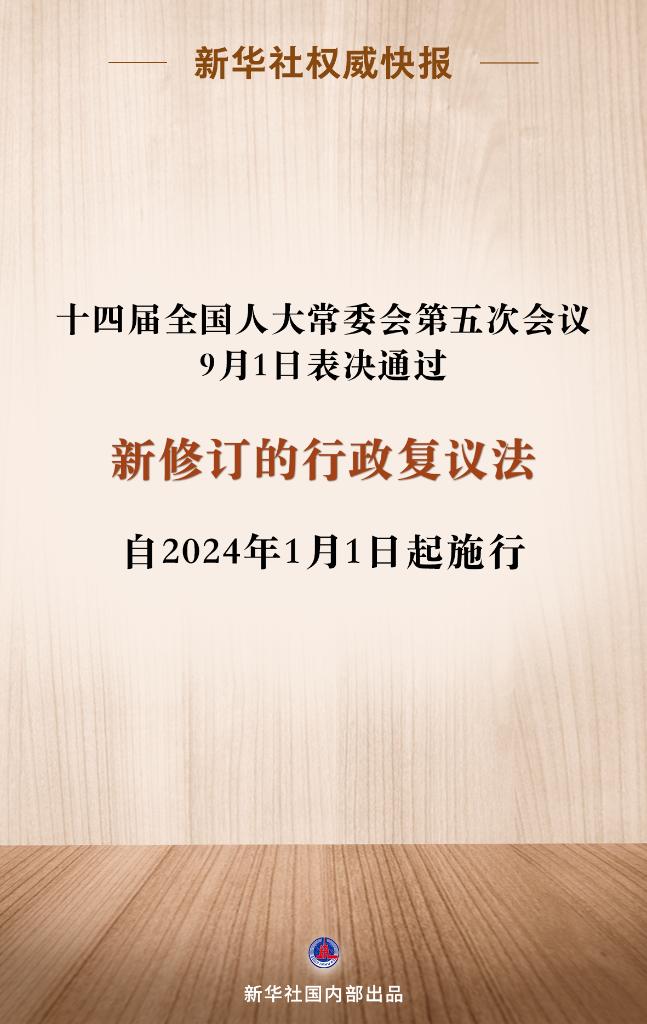 9月1日,十四届全国人大常委会第五次会议表决通过新修订的行政复议法,自2024年1月1日起施行。