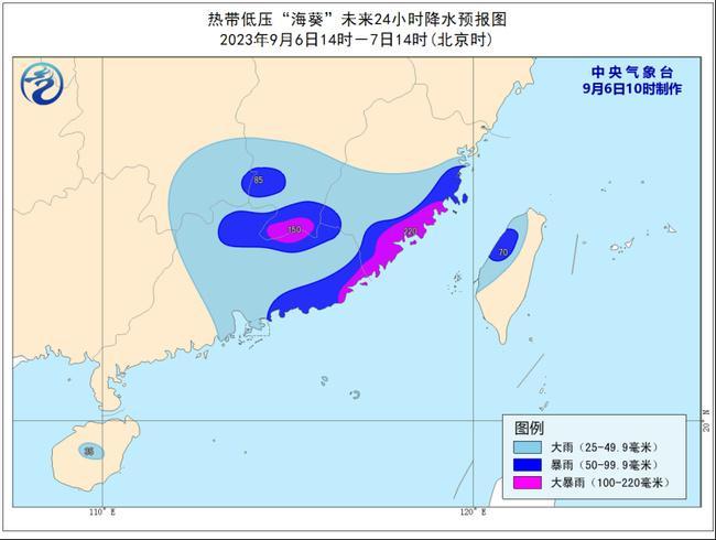 降水预报:9月6日14时至7日14时,福建东部和南部、广东中东部、江西南部、湖南东南部、海南岛中部、台湾岛西部等地部分地区有大雨,其中,福建东部和南部、广东东北部和东南部沿海、江西南部、台湾岛西北部等地部分地区有暴雨到大暴雨(100~220毫米)。