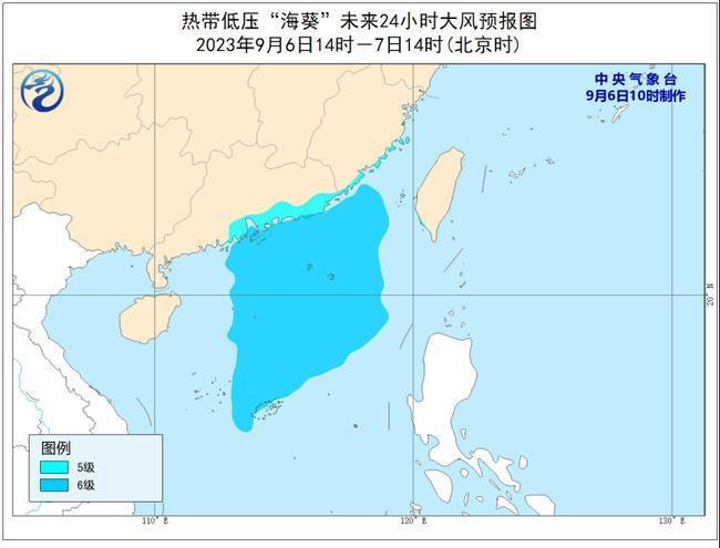大风预报:9月6日14时至7日14时,福建东南部及沿海、广东中东部及沿海、台湾岛西部沿海、台湾海峡、南海大部将有5-6级、阵风7-8级的风。