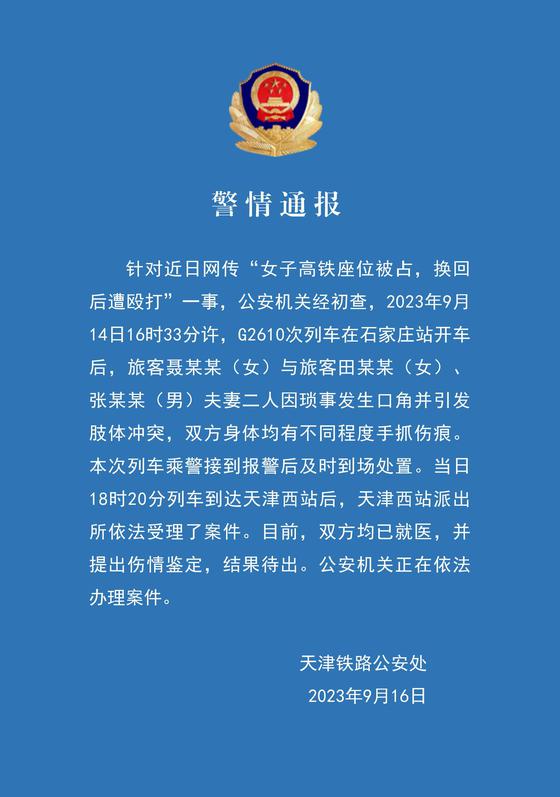中新网天津新闻9月17日电 北京铁路公安局天津公安处16日发布警情通报:针对近日网传“女子高铁座位被占,换回后遭殴打”一事,公安机关经初查,2023年9月14日16时33分许,G2610次列车在石家庄站开车后,旅客聂某某(女)与旅客田某某(女)、张某某(男)夫妻二人因琐事发生口角并引发肢体冲突,双方身体均有不同程度手抓伤痕。本次列车乘警接到报警后及时到场处置。当日18时20分列车到达天津西站后,天津西站派出所依法受理了案件。目前,双方均已就医,并提出伤情鉴定,结果待出。公安机关正在依法办理案件。(完)