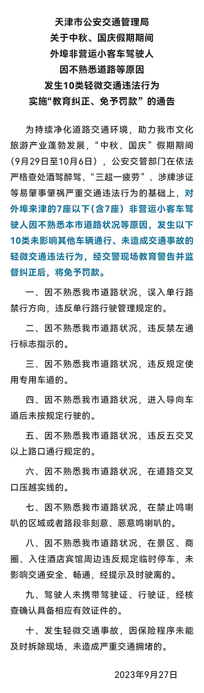 日前,记者从天津市公安局获悉,为持续净化道路交通环境,助力天津市文化旅游产业蓬勃发展,“中秋、国庆”假期期间(9月29日至10月6日),公安交管部门在依法严格查处酒驾醉驾、“三超一疲劳”、涉牌涉证等易肇事肇祸严重交通违法行为的基础上,对外埠来津的7座以下(含7座)非营运小客车驾驶人因不熟悉本市道路状况等原因,发生以下10类未影响其他车辆通行、未造成交通事故的轻微交通违法行为,经交警现场教育警告并监督纠正后,将免予罚款。