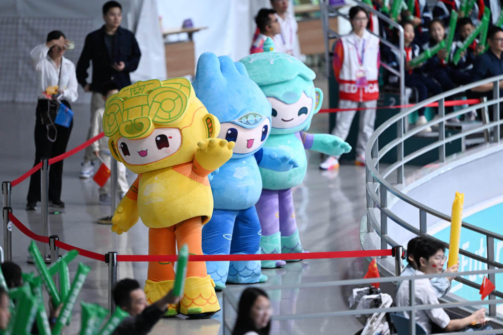 10月7日,杭州亚运会吉祥物在女子花样轮滑单人滑比赛前的暖场活动中。新华社记者 陈晔华 摄