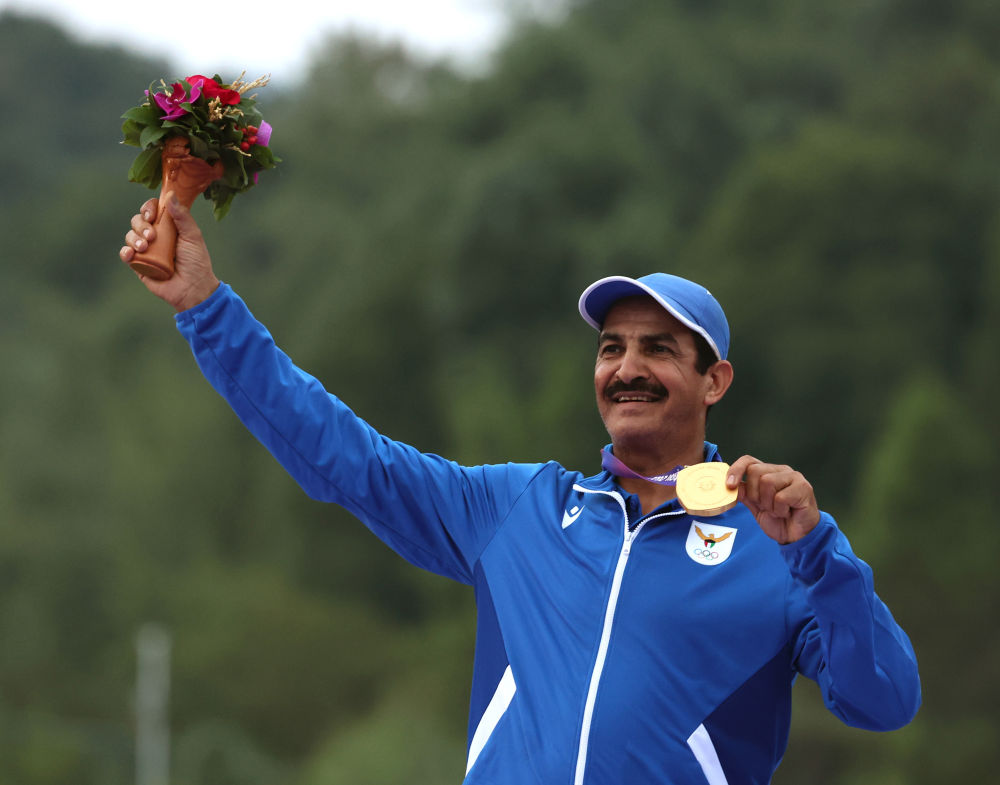 9月27日,金牌得主科威特选手阿卜杜拉·拉希迪在杭州亚运会射击项目男子双向飞碟个人赛颁奖仪式上。新华社记者 杜潇逸 摄