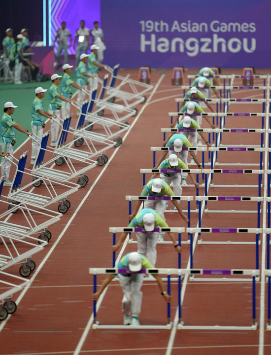 9月30日,杭州亚运会志愿者在田径项目女子七项全能100米栏比赛前进行场地准备工作。新华社记者 江文耀 摄