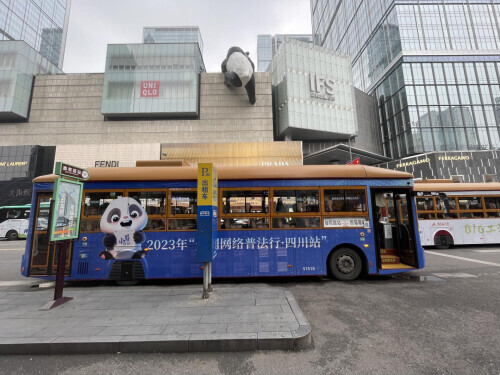 据成都公交集团新城市巴士有限公司工作人员介绍,未来一个月时间里,广大成都市民和来蓉游客都能在春熙路商圈的“网红”地标“熊猫爬墙”下,找到网络普法主题公交。而该主题公交在成都著名的“熊猫观光线”上运行,并往返于成都地标春熙路以及热门景点熊猫基地,途经宽窄巷子、文殊院。网络普法主题公交的上线,让公交车化身普法“宣传员”,也让网络普法宣传融入了城市交通、深入了大街小巷、进入了群众心中。