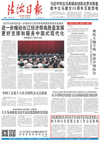 会议强调,要坚持不懈用党的创新理论凝心铸魂,在融会贯通、学悟笃行习近平法治思想和习近平文化思想上采取更多硬实举措。要加强宣传思想文化领域行政立法,加快完善相关法律法规体系。要坚定文化自信,深入推进社会主义法治文化建设,加强中华优秀传统法律文化保护、宣传和传承,弘扬社会主义核心价值观和法治精神。要扎实做好法治新闻宣传,讲好法治故事,巩固壮大主流思想舆论,守好意识形态阵地。要以钉钉子精神落实全国宣传思想文化工作会议部署,立足职能为在新的历史起点上继续推动文化繁荣、建设文化强国、建设中华民族现代文明提供有力法治保障。