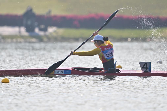 皮划艇是本届亚残运会的新增项目,比赛在杭州亚运会首金诞生地——富阳水上运动中心举行。女子单人皮划艇KL1级比赛中,谢毛三“驾驶”的红色皮划艇格外醒目。在观众的欢呼加油声中,最终她以55秒478的成绩夺得这枚颇具历史意义的金牌——这是亚残运会创办以来,中国队第一次在亚残运会中获得首金。