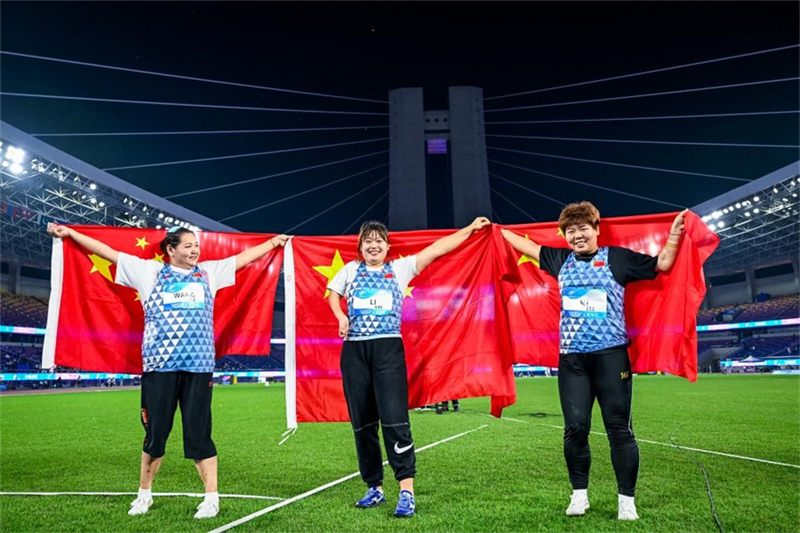 10月25日,冠军李英粒(中)、亚军米娜(右)和季军王君在女子铅球-F35/36/37级比赛后身披国旗庆祝。新华社记者伍志尊摄