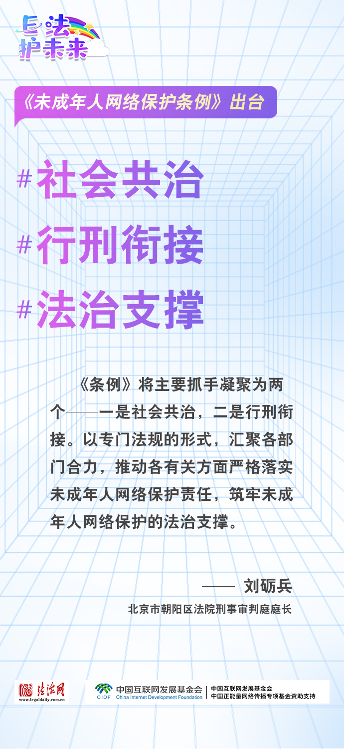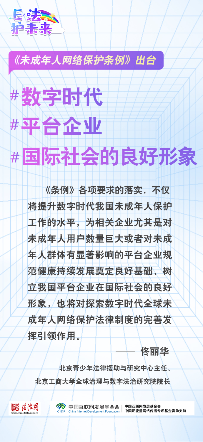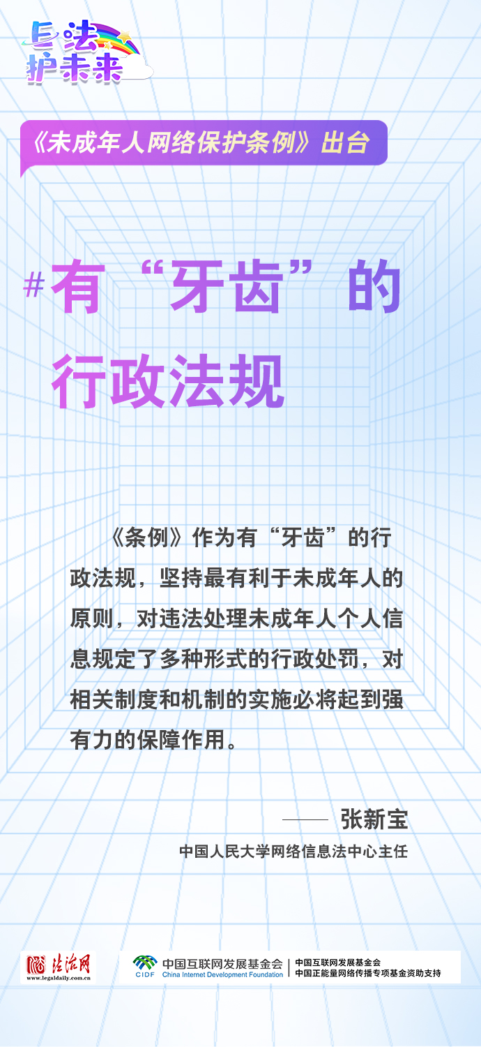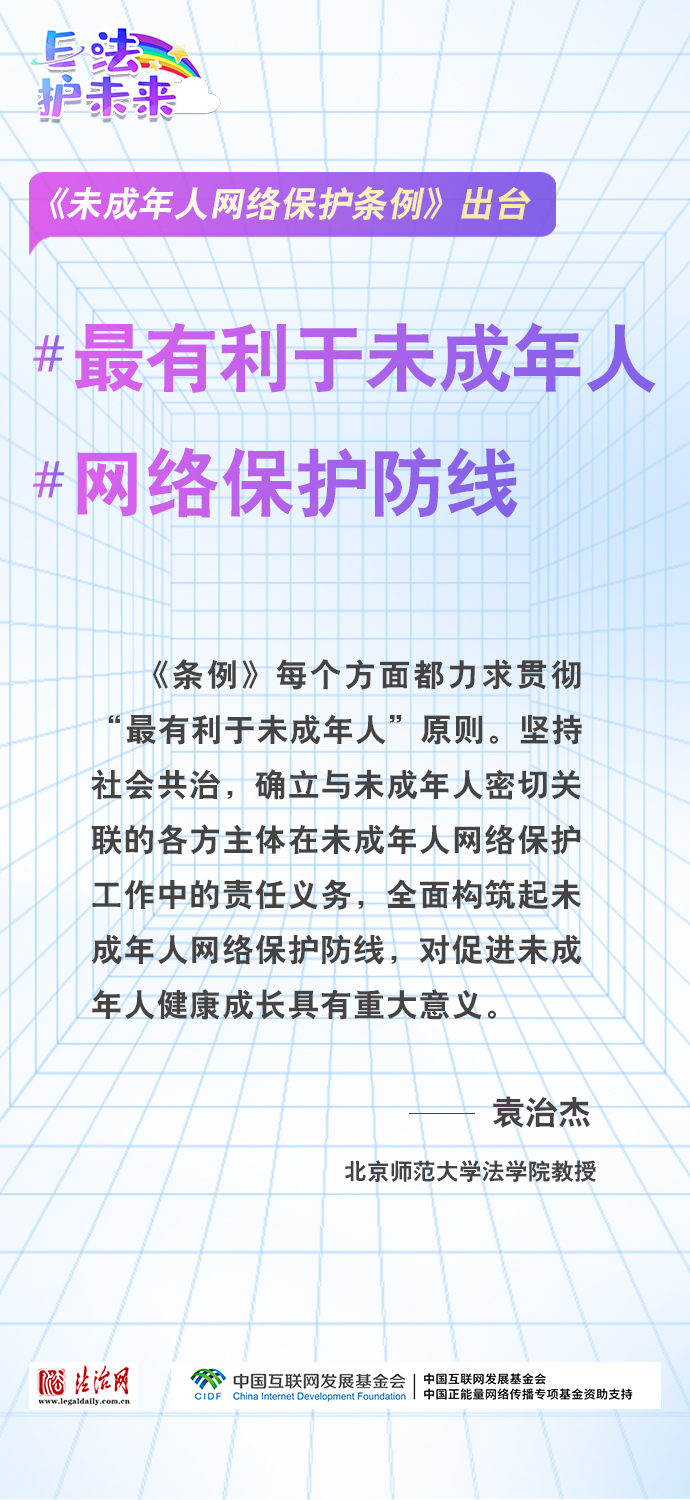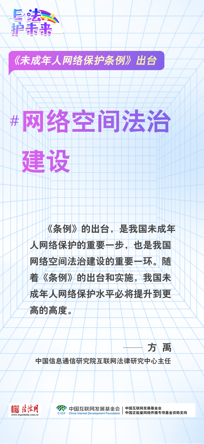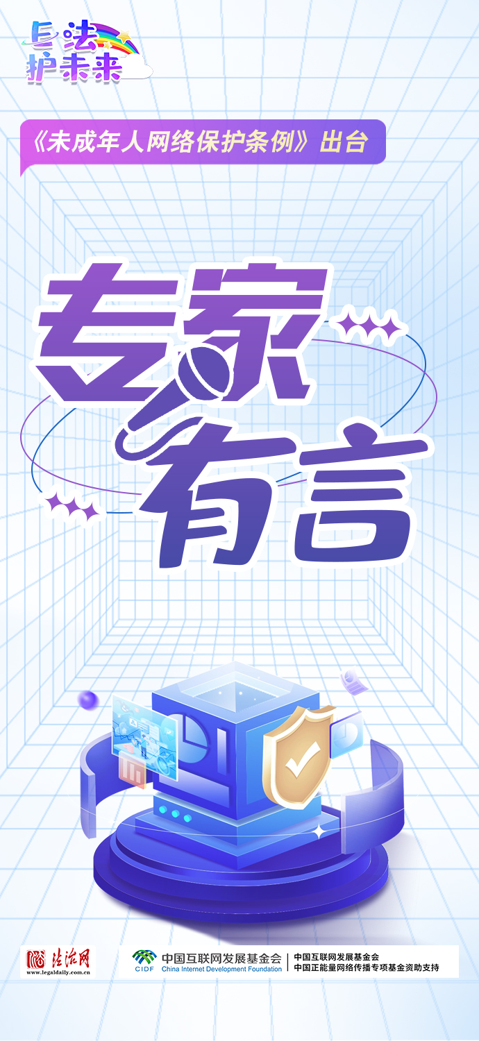 法治网特推出一组“专家有言”海报,内容涵盖《条例》出台的现实意义和时代价值、网络素养促进、网络信息内容规范、个人信息网络保护、网络沉迷防治等,充分展现《条例》的出台是我国互联网治理领域的法治成果,彰显中国在未成年人网络保护领域的担当,为全球未成年人网络空间治理提供指引和样本。