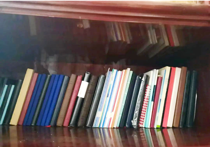 图为黄英德生前用过的笔记本,如今依然整齐地被摆放在柜子里。