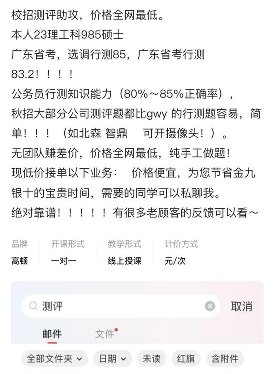 “笔试行测,春秋招及实习,运营商、互联网、银行等,北森、塞码、智鼎、前程无忧、智联等,经验丰富,包括逻辑填空、图形推理、资料分析等。”另一条帖子中,卖家名义上主打“笔试行测一对一辅导”。