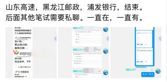 “XX高速、XX邮政、XX银行,结束。后面其他笔试需要私聊。一直在,一直有。”在某助考卖家的QQ空间里,几乎每天都要发布多家企业的“发车”公告。从所配截图可以看出,XX高速群成员有10人,页面显示带有答案的题目。而XX银行群成员有9人,同样用红字标出每道题的答案。