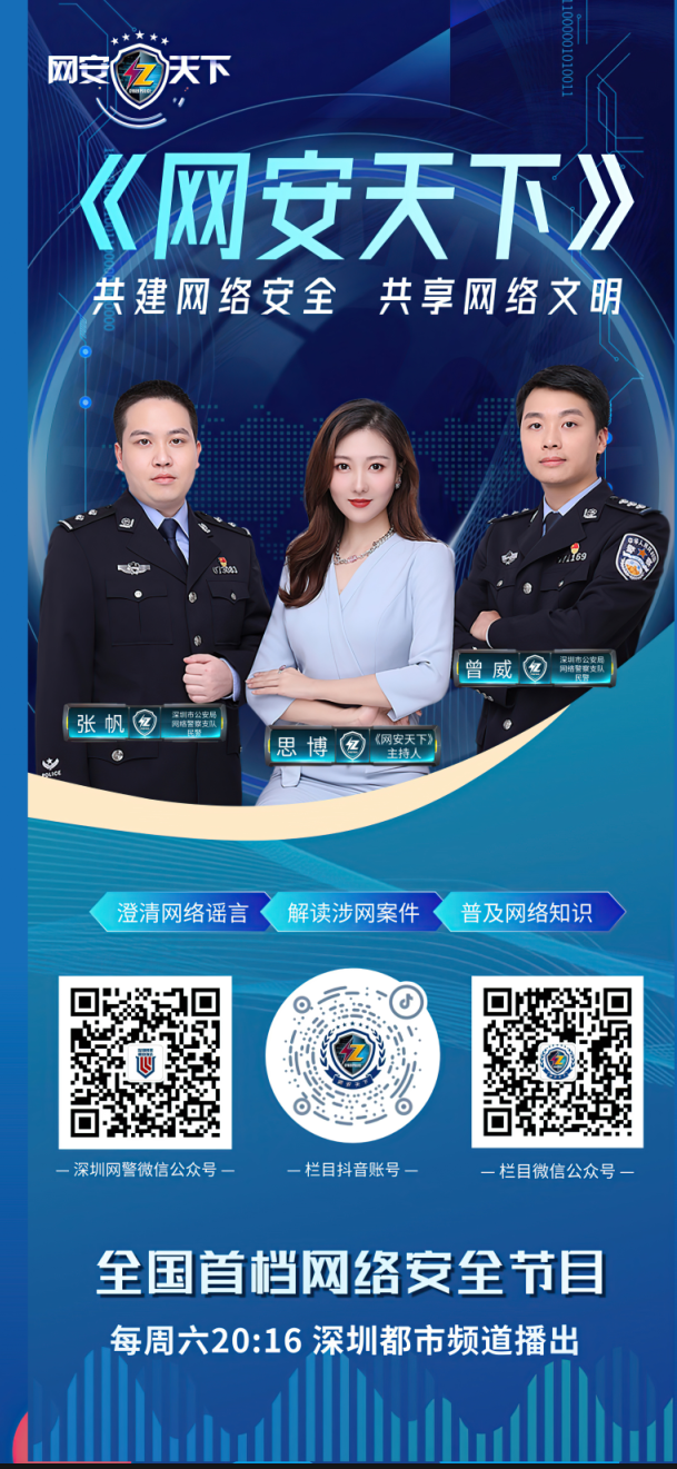据了解,《网安天下》是全国首档网络安全电视节目,由深圳广播电影电视集团与深圳市公安局网络警察支队联合打造,由中国平安集团冠名播出,以关注网络安全、涉网案件、网络公共秩序的维护和网络安全知识为主;以净化网络环境、构建网络空间命运共同体为宗旨。