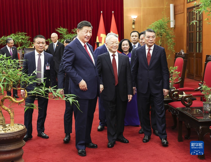 当地时间12月12日下午,刚刚抵达河内的中共中央总书记、国家主席习近平在越共中央驻地同越共中央总书记阮富仲举行会谈。新华社记者 申宏 摄