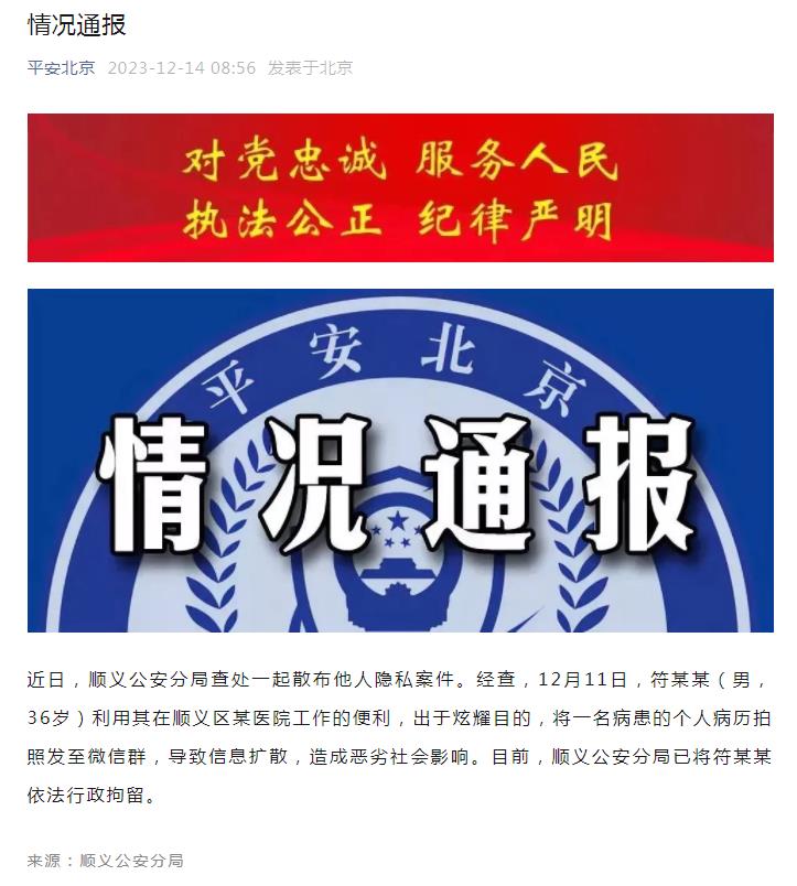 中新网12月14日电 据北京市公安局官方微信消息,近日,顺义公安分局查处一起散布他人隐私案件。经查,12月11日,符某某(男,36岁)利用其在顺义区某医院工作的便利,出于炫耀目的,将一名病患的个人病历拍照发至微信群,导致信息扩散,造成恶劣社会影响。目前,顺义公安分局已将符某某依法行政拘留。