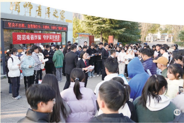 图③:渭南中院干警在大学校园宣传预防电信诈骗法律知识。