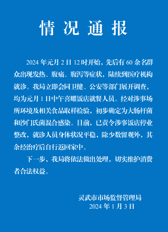 中新网1月4日电 据灵武市市场监督管理局微信公众号消息,2024年1月2日12时开始,宁夏灵武市先后有60余名群众出现发热、腹痛、腹泻等症状,陆续到医疗机构就诊。灵武市市场监督管理局立即会同卫健、公安等部门展开调查,均为1月1日中午在本地喜耀饭店就餐人员。经对涉事场所环境及相关食品取样检验,初步确定为大肠杆菌和沙门氏菌混合感染。目前,已责令涉事饭店停业整改,就诊人员身体状况平稳,除少数留观外,其余经治疗后自行返回家中。
