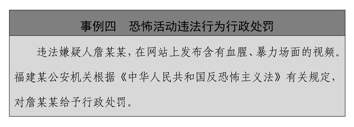 ——遵循恐怖活动违法行为处罚原则。中国执法机关处罚恐怖活动违法行为,坚持行政处罚法定原则,严格遵守反恐怖主义法、治安管理处罚法、行政处罚法等法律的明文规定。坚持过罚相当原则,确保处罚与违法行为的事实、性质、情节以及社会危害程度相当。坚持一事不再罚原则,对同一个违法行为,不得给予两次以上罚款的行政处罚,同一个违法行为违反多个法律规范应当给予罚款处罚的,按照罚款数额高的规定处罚。执法机关落实行政裁量权基准制度,细化量化行政执法行为的裁量范围、种类、幅度等并对外公布。2018年以来,安徽、浙江、北京、黑龙江等地公安机关相继制定并实施行政处罚裁量基准,对反恐怖主义行政执法行为进行了规范。