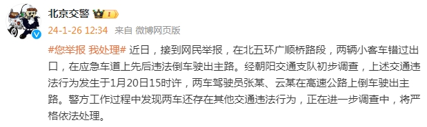 中新网1月26日电 据北京市公安局公安交通管理局官方微博消息,近日,接到网民举报,在北五环广顺桥路段,两辆小客车错过出口,在应急车道上先后违法倒车驶出主路。经朝阳交通支队初步调查,上述交通违法行为发生于1月20日15时许,两车驾驶员张某、云某在高速公路上倒车驶出主路。警方工作过程中发现两车还存在其他交通违法行为,正在进一步调查中,将严格依法处理。