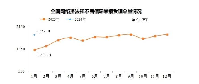 中新网2月7日电 据中央网信办举报中心微信公众号消息,2024年1月,中央网信办举报中心指导全国各级网信举报工作部门、主要网站平台受理网民举报色情、赌博、侵权、谣言等违法和不良信息1854万件,环比下降1.4%、同比增长40.3%。