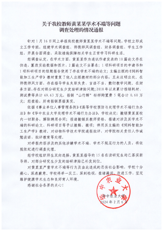 2月6日,华中农业大学通报教师黄某某学术不端等问题调查处理情况 。具体如下: